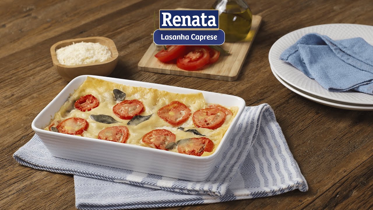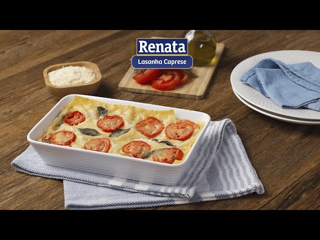 Unte um refratário com manteiga. Faça camadas de massa, queijo, tomate e manjericão.