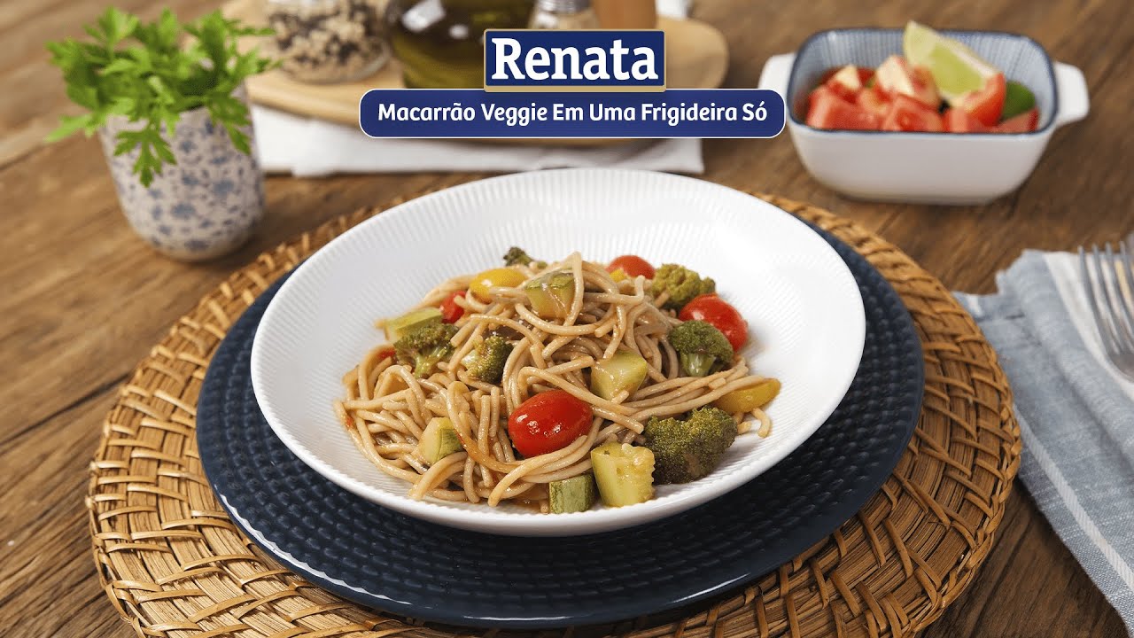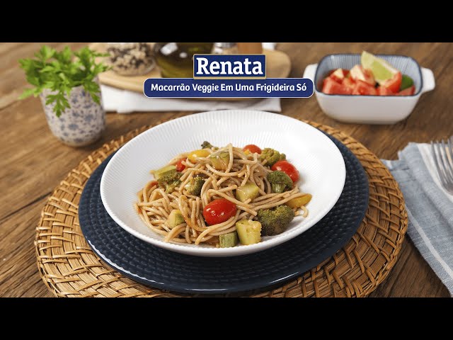 Receita de Macarrão Renata Veggie Protein+ com vegetais preparada em uma única frigideira.