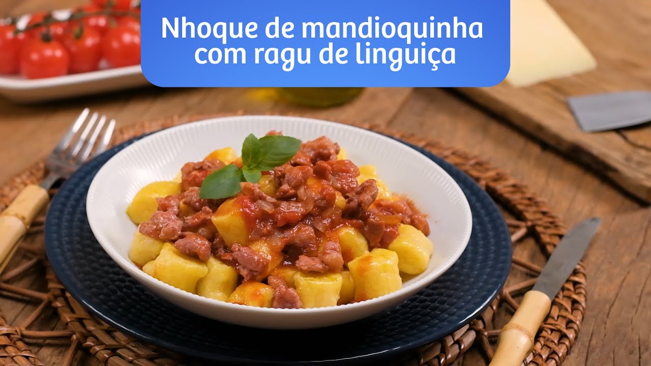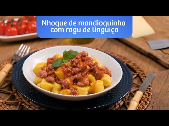 Nhoque de massa de mandiquinha e Farinha de Trigo RENATA ao ragu de linguiça.