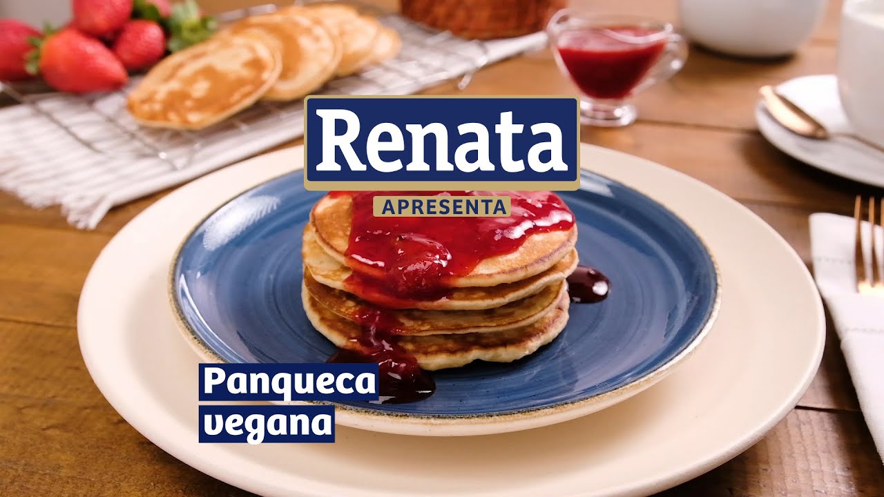 Panqueca doce feita com leite vegetal e óleo de coco com recheio de geleia de morangos.