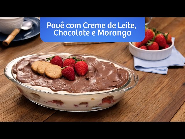 Pavê de Creme de Leite, Chocolate e Morango com Biscoito RENATA Integrale sabor Morango.
