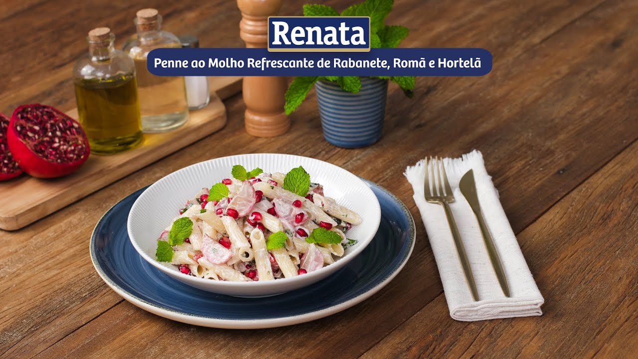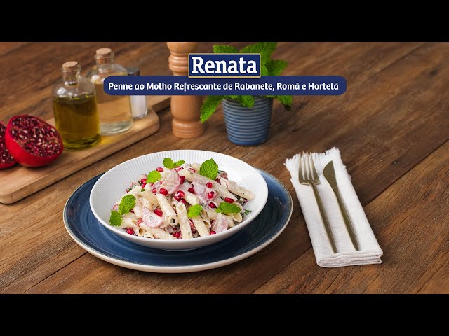 Receita de Penne ao Molho Refrescante de Rabanete, Romã e Hortelã preparada com Macarrão Renata Sem Glúten Pena.