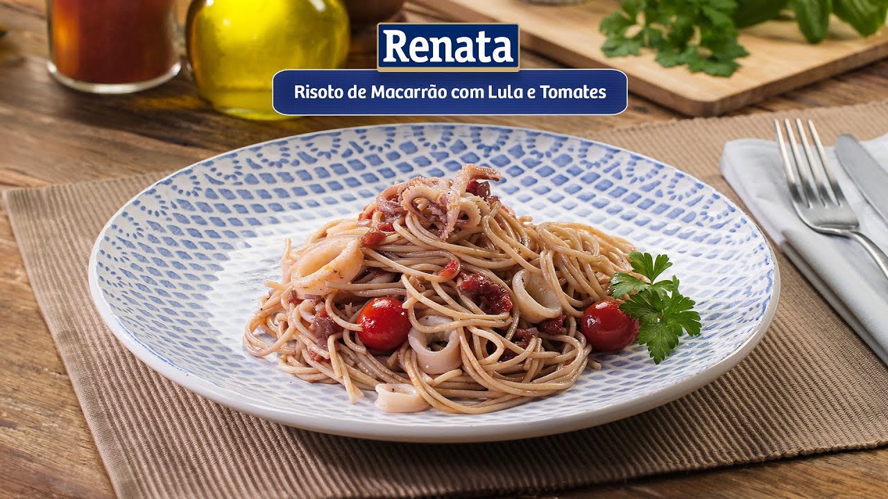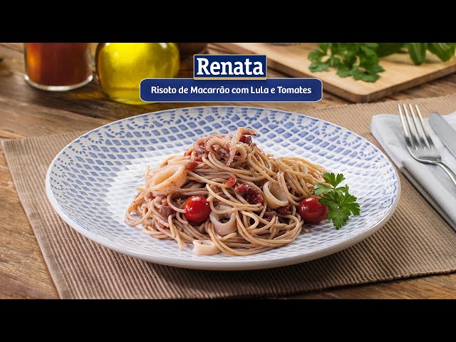 Risoto de Macarrão Renata, preparado com lulas tenras e tomates suculentos, oferecendo um toque de sofisticação ao seu prato.