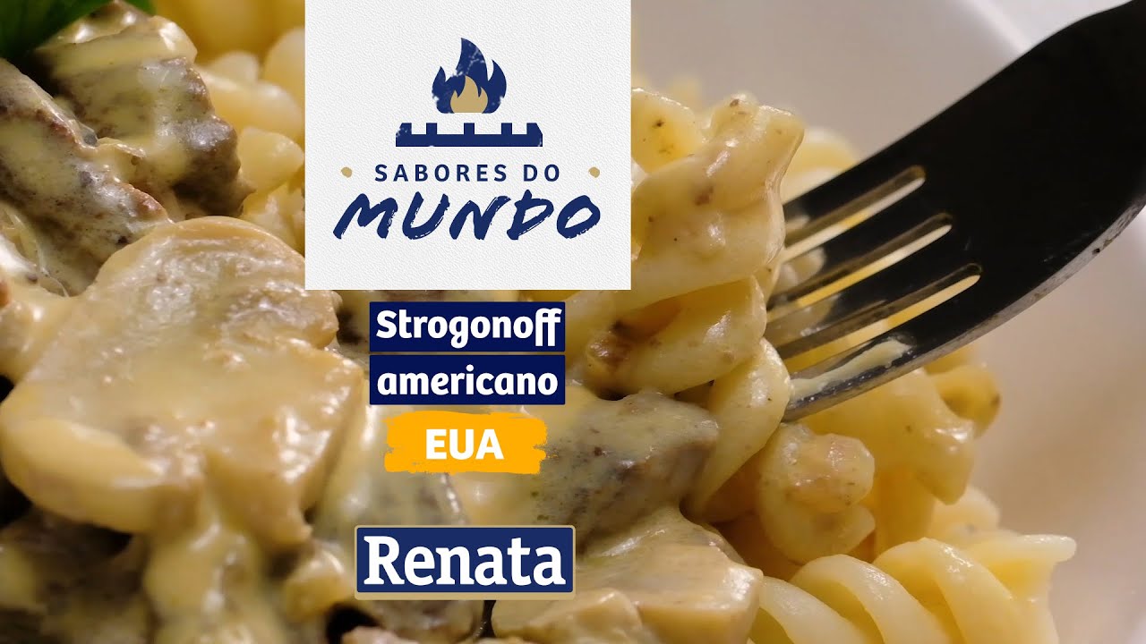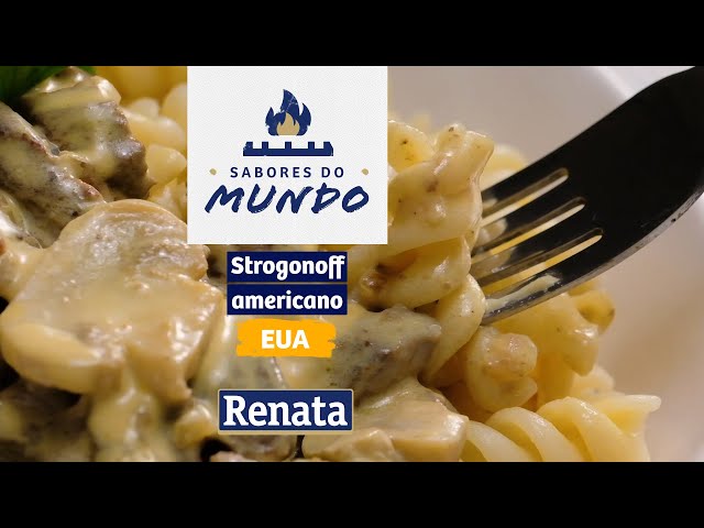 Prato feito à base de Macarrão Renata Parafuso e tiras de carne bovina ao molho de creme de leite e cogumelos.
