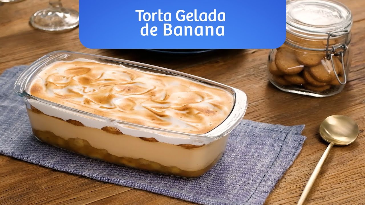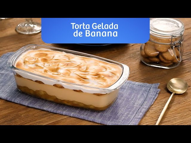 Sobremesa com base de Biscoito Renata Integral sabor Banana, recheada com bananas e doce de leite. A cobertura é com claras em neve.
